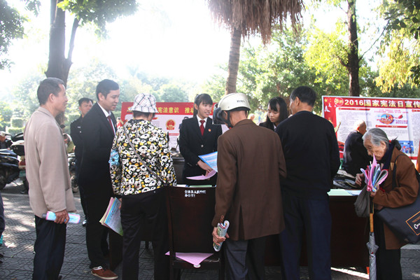 12月4日是我国第三个宪法日,为提高广大人民群众的法律意识,做好普法宣传,12月5日,日博备用网址在合浦县人流密集点还珠广场组织开展了主题为“弘扬法治精神建设法治合浦”宪法宣传日活动,通过现场悬挂横幅,摆放展板,设置咨询台,发放宣传单,与群众面对面,进行法律知识宣传和解答。同时借助此次宣传活动向广大群众发放群众安全感满意度宣传资料,并耐心向群众解答,努力提升群众安全感和满意度。